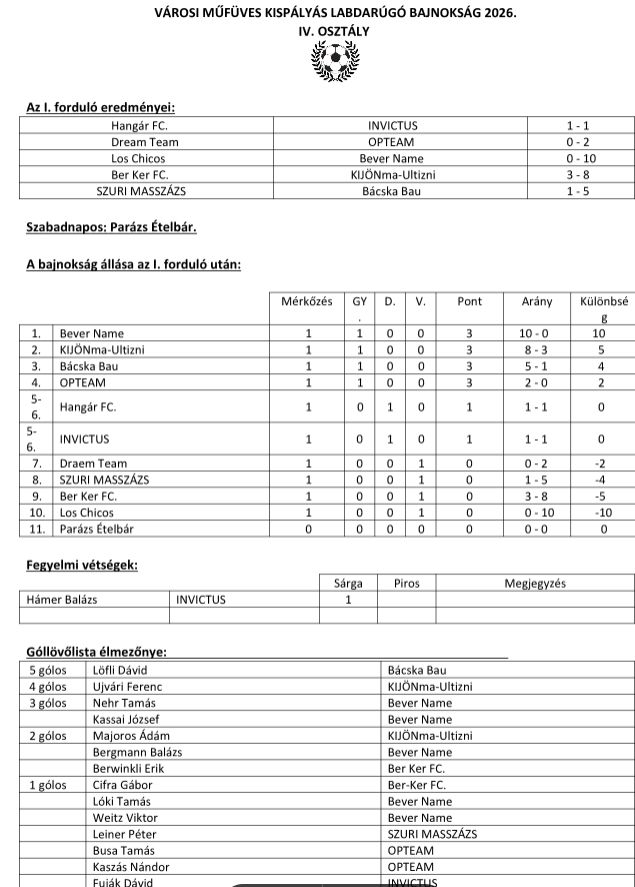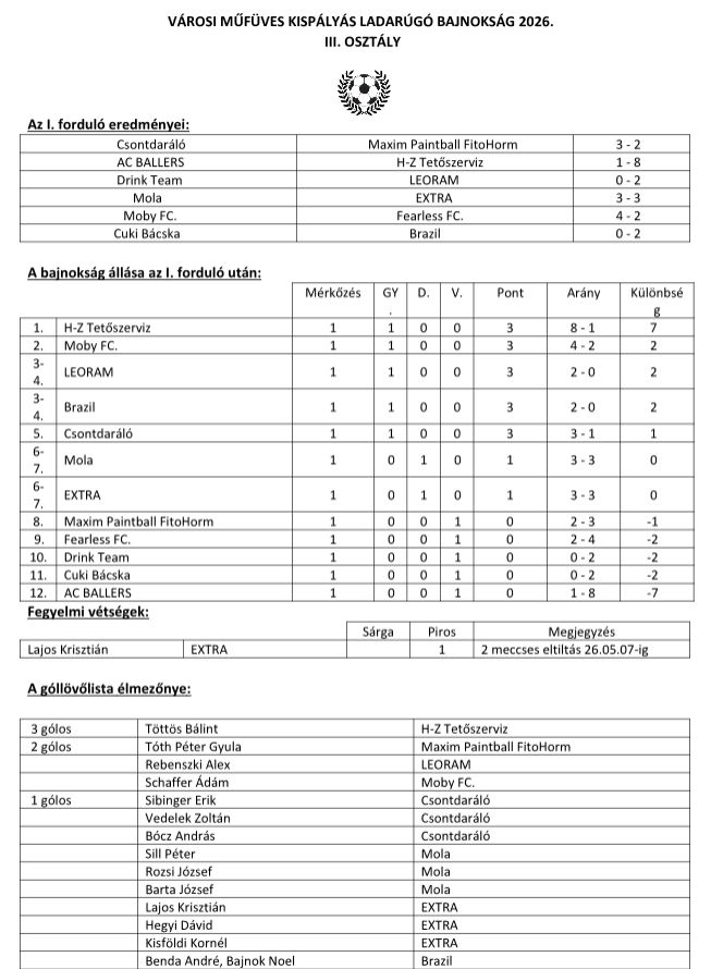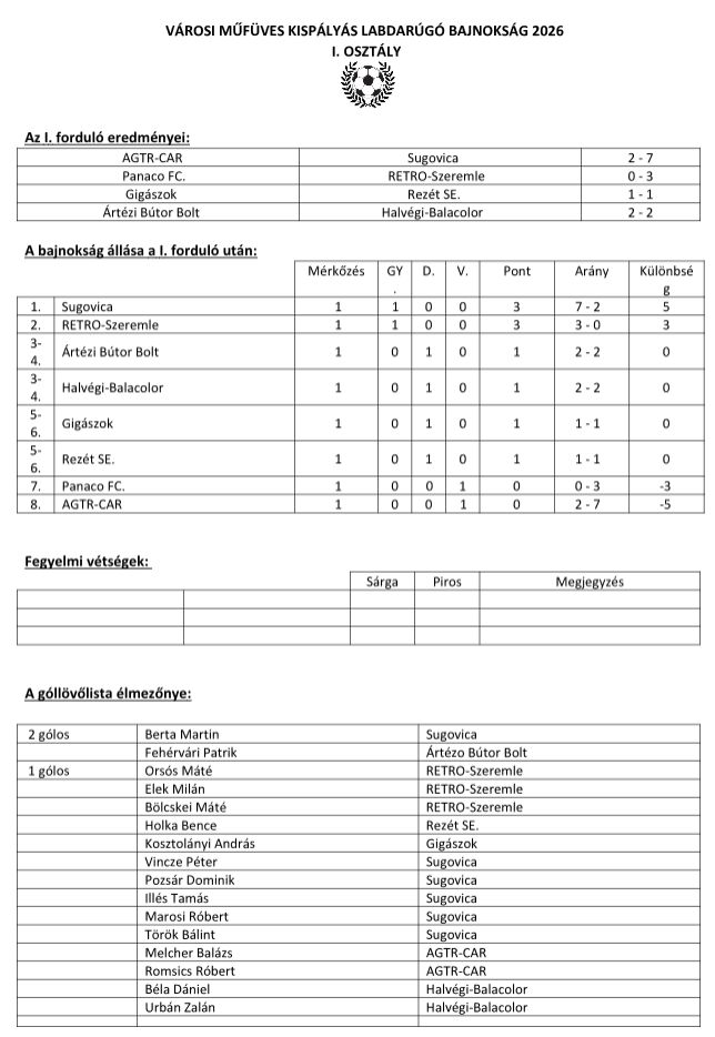 Városi Szabadtéri Labdarúgó Bajnokság I. fordulójának eredményei