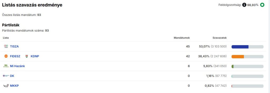 A szavazatok közel 99%-os feldolgozottsága alapján kijelenthető, hogy biztos hogy több,mint kétharmados támogatottsága lesz a Tisza Pártnak a parlamentben. Ehhez 133 képviselőre lett volna szükségük, de jelen számítások szerint 138-cal fognak rendelkezni. A Fidesz – KDNP-nek 55, a Mi Hazánknak 6 jutott. A többi párt nem került be az országgyűlésbe.